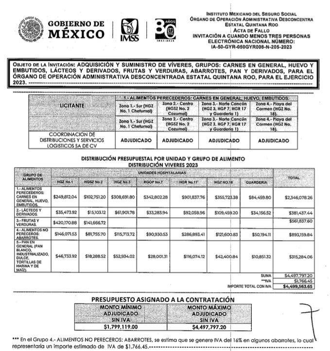 Además, señalan, a la empresa Coordinación de Distribuciones y Servicios Logísticos se suma otro contrato adjudicado por dedazo el IBQROO/005/2024 para el suministros de víveres al hospital de IMSS-Bienestar de Nicolás Bravo por un monto de $3,232,758.62 pesos.