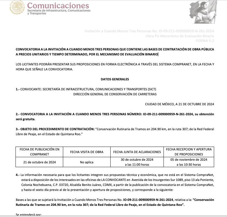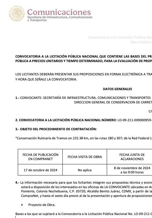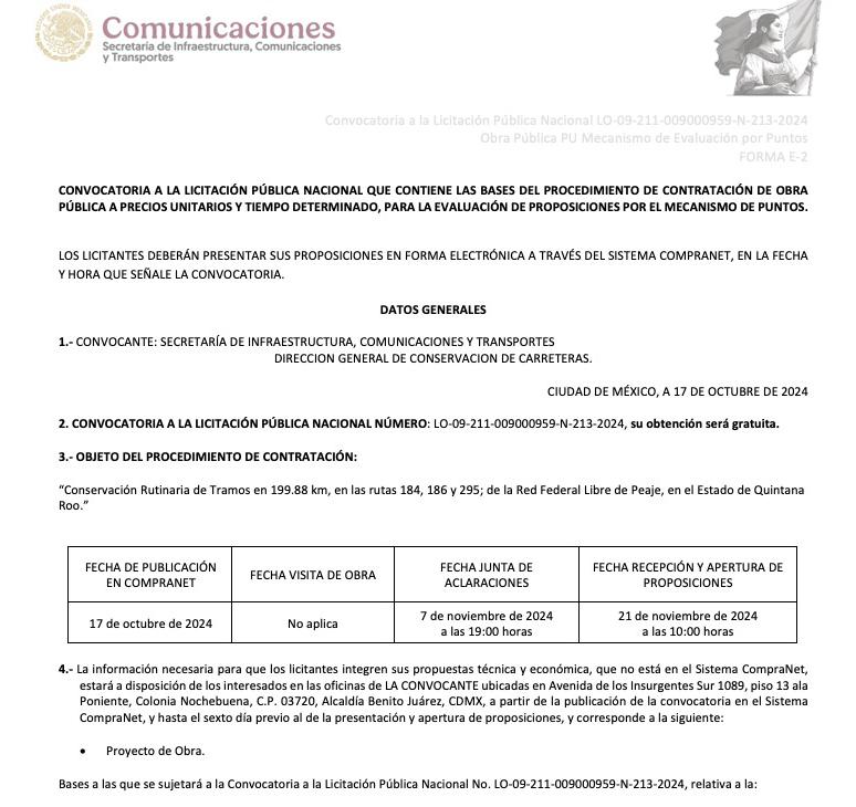 La licitación pública nacional LO-09-211009000959-N-213-2024 contempla la conservación rutinaria de tramos en 199.88 kilómetros, en las rutas 184, 186 y 295, de la red federal libre de peaje, en Quintana Roo. Y por último, está la licitación pública No. LO-09-211-009000959-N-215-2024 para las conservación rutinaria de tramos en 225.38 kilómetros, en las rutas 180 y 307, de la red federal libre de peaje, en el estado de Quintana Roo.