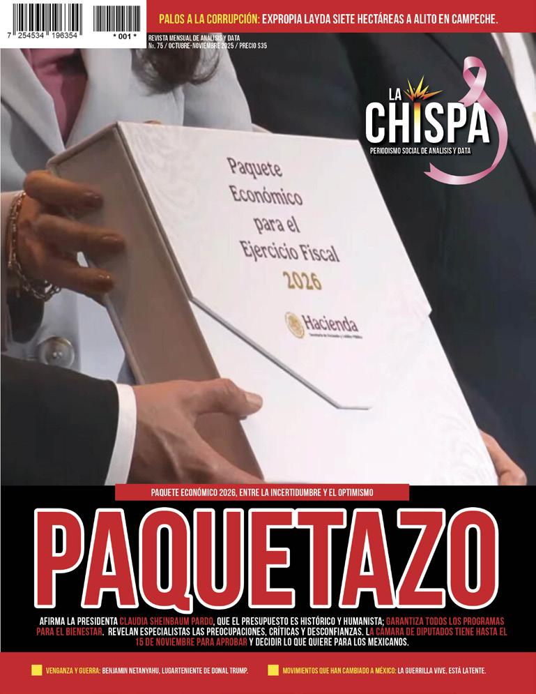 Periodismo social de análisis y data: Revista mensual de Circulación Nacional, Edición #57, octubre-noviembre de 2025. Centro de Estudios e Investigación y Gobernabilidad S.A. de C.V.; Reserva de Derechos al Uso Exclusivo 04-2025051513573800-102; Certificado de Licitud de Título y Contenido No. 17696. La Chispa es una publicación editada en sus oficinas ubicadas en Calle 23, Plaza San Antonio 110, Local 34, Col. México, C.P. 97125, Mérida, Yucatán; Impresa por la Editorial GSM; Col. Juan Aldama N°. 75, Buenavista, alcaldía Cuauhtémoc, C.P. 06350. Ciudad de México; Distribuido por comercializadora ABREVER; calle. San Raúl. Mz581. Lote 19, Local 1. C.P. 04600. Col. Santa Ursula Coapa, alcaldía Coyoacán, CDMX. Los textos publicados, opiniones, investigaciones, puntos de vista de los colaboradores no reflejan la opinión de LA CHISPA, quedan bajo la responsabilidad de los autores.