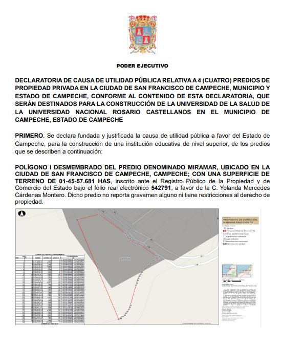 En la Sección Administrativa del Diario Oficial, el Poder Ejecutivo de Campeche informó la “Declaratoria de causas de utilidad pública de cuatro predios de propiedad privada en la ciudad de San Francisco Campeche (…) que serán destinados para la construcción de la Universidad de la Salud de la Universidad Nacional Rosario Castellanos”.