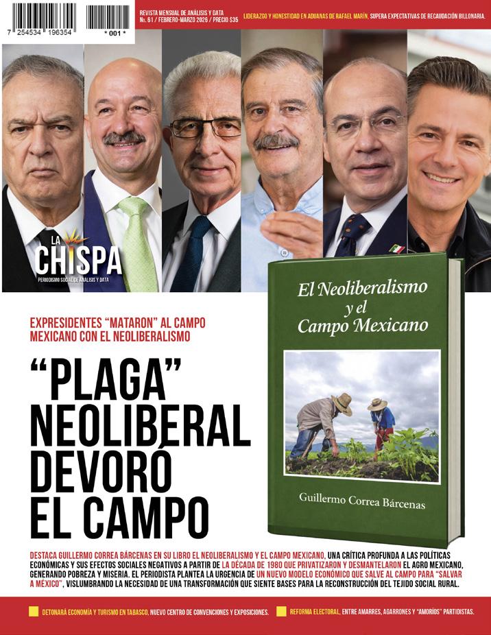 Pero para entender lo que ha sido el neoliberalismo en nuestro país, los efectos negativos que ha traído, no solo a la producción agroalimentaria, sino en general a la economía nacional, el destacado periodista mexicano Guillermo Correa Bárcenas nos explica a detalle, en su libro “El Neoliberalismo y el Campo Mexicano”, un documento basado en sus experiencias periodísticas y que han sido publicadas en prestigiados medios como la revista Proceso y ahora Editor responsable como Director Editorial de Revista La Chispa.