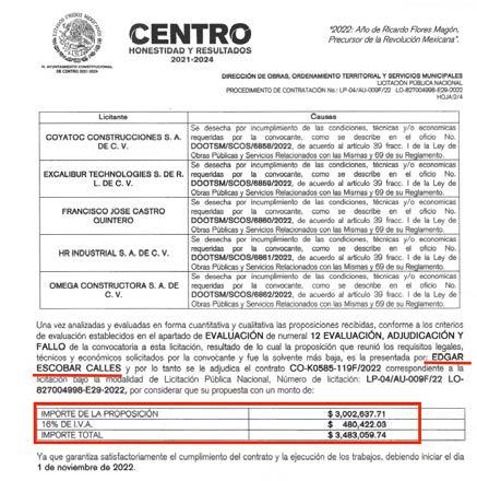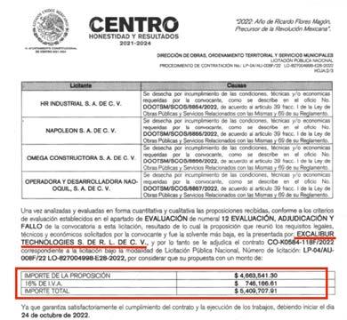 También ganó la licitación pública nacional LO-827004998-E3-2022 para mantenimiento de carpeta de concreto asfáltico en caliente en la Av. Gregorio Méndez Magaña por un monto de 6 mi llones 995 mil 878.80 pesos.