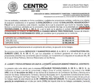 Cabe señalar, que le firma Excalibur Technologies en la presente administra ción de Centro había ganado la invita ción restringida IO-827004998-E5-2022 para el mantenimiento de carpeta de concreto asfáltico en caliente, en peri férico Carlos Pellicer Cámara, colonia Asunción Castellanos, por 4.5 MDP.