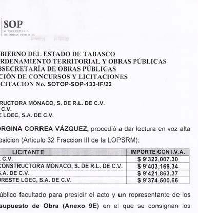 Para la licitación restringida SOTOPSOP-137-IF/22, la SOTOP invitó a las empresas: Construcciones Vanguardis tas del Sureste SA de CV, representada legalmente por Gabriel Armenta Váz quez;