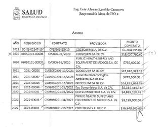 dos fueron el CV0805020103/2022 forma lizado con la empresa ECO Suministros SA de CV, por $4,869,199.76 pesos, y el CV0805020104/2022 por un monto de $3,159,000 pe sos, a favor de Public Healt Su pply And Equip ment de México SA de CV.