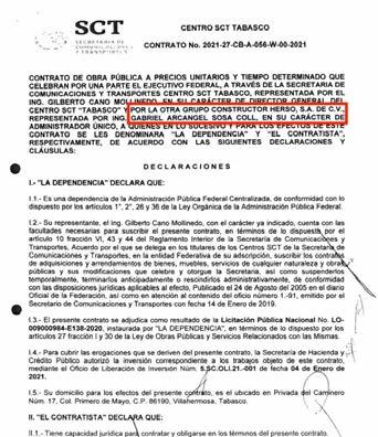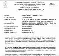 secretario de la CMIC, CARVA Grupo Empresarial SA de CV y SCAVIAD SA de CV, ganaron cada una un contratos en el H. Ayuntamiento de Tacotalpa por $2,712,610.84 pesos y $2,557,624.04 pesos, respectivamente.