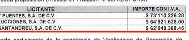 Las otras propuestas que se quedaron en la orilla fueron las de Merodio Construcciones SA de CV, de Jaime Merodio Calix, que ofertó 64 millones 921 mil 628 pesos; y Cimentaciones y Puentes SA de CV, de los empresarios Cesar Antonio González González, José Eduardo Gómez Domínguez, José Manuel Jiménez Izquierdo y Manuel San Vicente Fernández, que propuso 73 millones 110 mil 226.28 pesos.