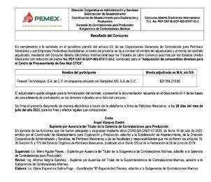 Tras un largo proceso de adjudicación, que empezó desde el pasado 26 de enero, y tras largos seis meses de retrasos y diferimientos, el pasado 28 de julio, Ángel Vázquez Sastré, suplente por Ausencia del Titular de la Gerencia de Contrataciones para Producción emitió el fallo a favor del consorcio conjunto conformado por las empresas Sanpetrol XXI SA de CV y Firewall Technologies SA de CV, propiedad de Pablo Emmanuel Rábago Silva, para la adquisición de consumibles diversos para el Centro de Proce-