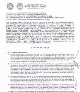 Con la Laura Beristain Navarre te, los contratos en Solidaridad si guieron fluyendo. El 18 de junio de 2019 se le adjudicaron los trabajos para construir varios puentes pea tonales por $4,895,620.08 pesos; y para el 30 de octubre del año 2019 formalizó el contrato MSOL-DGIDU MAyCC-R33-046-2019 para la cons trucción de estacionamientos laterales a la Plaza Cívica, jardinería, y control de acceso a Presidencia en el nuevo Palacio Municipal por $6,042,447.37 pesos.