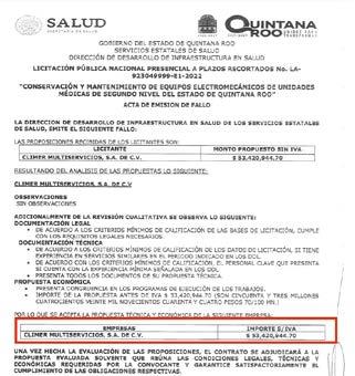 La semana pasada LA CHISPA Quintana Roo daba cuenta que otra empresa tabasqueña CLIMER Multiservicios SA de CV, señalada en investigaciones militares de coaccionar con viajes a ex funcionarios de Pemex, ganó el fallo de la licitación LA-923049999-E1-2022 para la conservación y mantenimiento de equipos electromecánicos de unidades médicas de segundo nivel del estado de Quintana Roo por un monto de $53,420,944.70 pesos.