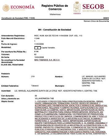 La empresa MAC Tabasco SA de CV, cuyo objeto social No. 1 es la construcción en general de obras viales, urbanización, terracería, puentes, redes de pavimentación,drenaje-alcantarillado, edificaciones de casa-habitación, etc., ganó el contrato de servicio de limpieza