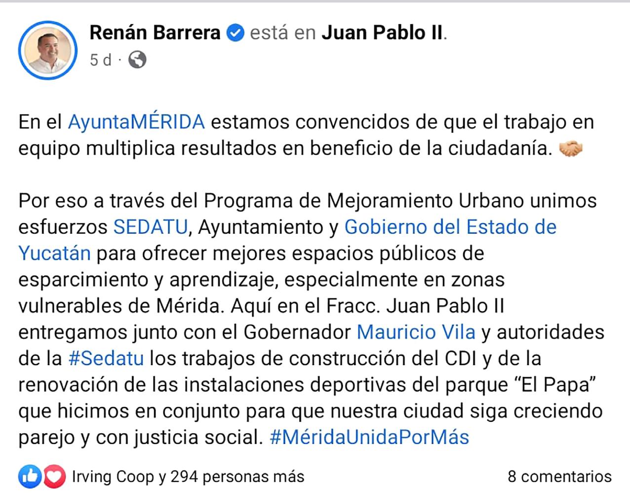 DESTACAN QUE DESDE MÉRIDA, UNIENDO ESFUERZOS POR LA CIUDADANIA, EL GOBIERNO ESTATAL, AYUNTAMIENTO Y DELEGACIONES FEDERALES, TRABAJANDO EN EQUIPO MULTIPLICAN RESULTADOS QUE FORTALECEN EL MEJORAMIENTO URBANO, GENERAN CONDICIONES DE INNOVACIÓN, DESARROLLO ECONÓMICO Y JUSTICIA SOCIAL, SOBRE TODO EN ZONAS VULNERABLES QUE MERECEN CALIDAD DE VIDA. RENÁN BARRERA CONCHA Y MAURICIO VILA ACTIVAN ACCIONES Y HERRAMIENTAS PARA SEGUIR CRECIENDO. 3
