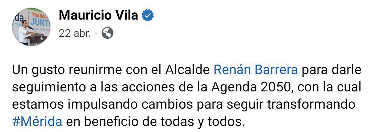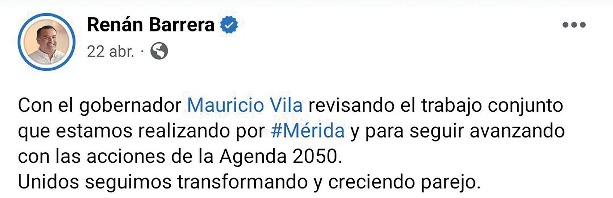 Con el fin de continuar avanzando hacia un mejor futuro para los habitantes de Mérida y todas las familias del estado, el Gobernador Mauricio Vila Dosal y el alcalde Renán Barrera Concha se reunieron para refrendar el compromiso; revisar, evaluar y dar seguimiento a la agenda 2050 que vienen "Trabajando juntos", impulsando cambios, transformando Mérida y Yucatán que son una referencia nacional e internacional; con programas; acciones y planes en diversos rubros a favor de un mejor futuro para la