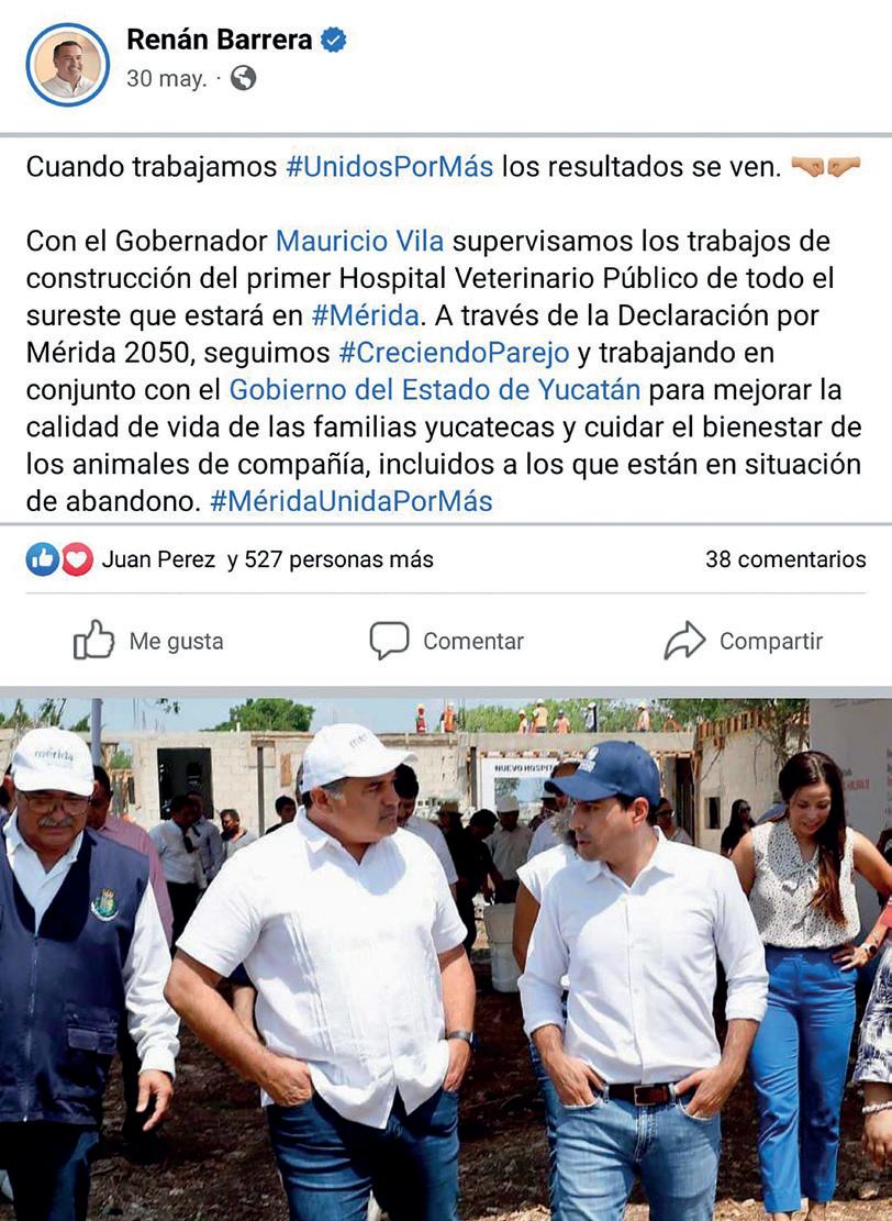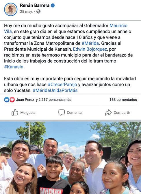 Renán Barrera ha expresado en redes sociales: "Yucatán es un solo equipo y la unidad es el camino para consolidar y potenciar la transformación de nuestro estado con más cambios. Un Yucatán cada vez más justo, productivo y el bienestar de todas las familias yucatecas es nuestro objetivo".