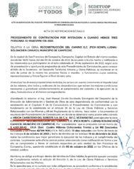 La asignación fue el pasado 3 de octubre, a través de la invitación res tringida IO-904012996-E16-2022, para los trabajos de reconstrucción del camino E.C. (Pich-Bon fil-Lubna)- Bo lonchen Ca huich, en el municipio de Campeche y por un monto de 4 millones 831 mil 251.42 pesos.