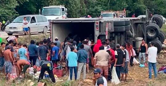 Unas ocho horas necesitaron los pobladores de comunidades cercanas para saquear el tráiler de doble remolque que trasportaba más de 70 toneladas de productos lácteos, luego de que el chofer se dormitara en el kilómetro 168 de la carretera Champotón-Campeche. A escasos metros de llegar a la caseta de cobro y a la altura de la localidad de Villamadero, el conductor de la unidad de carga perdió el control del volante y al salirse del camino terminó sobre su costado izquierdo entre la hondonada.