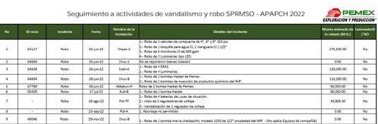 Según informes de PEP; el 15 de julio del 2022 de nueva cuenta se cometieron actos ilícitos en la plataforma Akal—C y se llevaron otra bomba Haskel, modelo DF-B605-1345, con un valor de 42 mil 987.95 pesos; y el 6 de septiembre hubo un atraco en la plataforma Akal-L y se llevaron dos equipos ERA, con un valor de 232 mil 664.34 pesos.