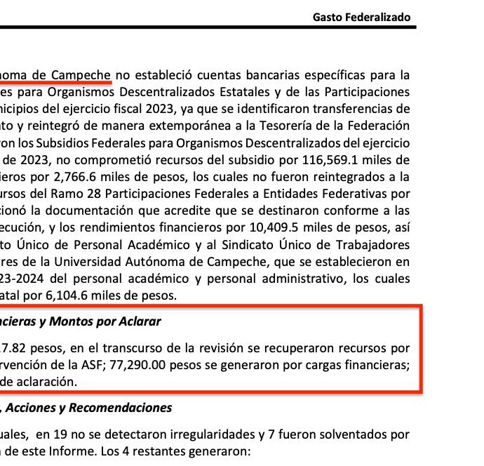 La ASF también señaló que la Universidad Autónoma del Carmen no reintegró a la Tesorería un monto de 2 millones 030.5 mil pesos y no reportó con calidad y congruencia la información remitida, a la Secretaría de Hacienda y Crédito Público, por lo que se determinaron $2,030,526.22 pesos pendientes por