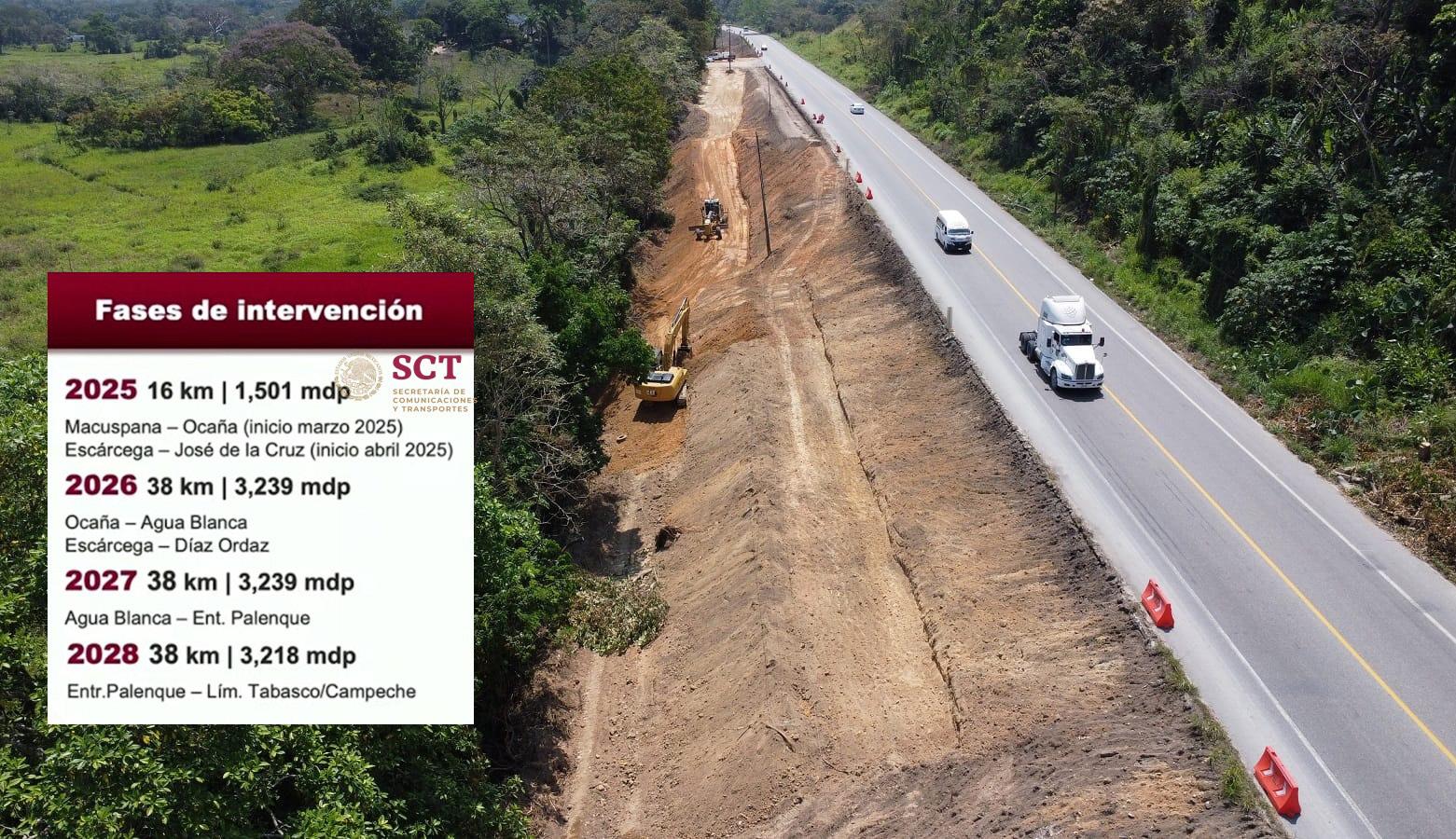 Para 2025, la SICT ya adjudicó un total de cuatro contratos para la intervención de 16 kilómetros del tramo Macuspana-Escárcega con una inversión de 1,500 millones de pesos, de los cuales ya se adjudicaron en obra física la suma de $1,221 millones 112 mil 447.63 pesos; para el 2026 se trabajará en 38 kilómetros adicionales, en 2027 otros 38 kilómetros y la obra concluirá en 2028.