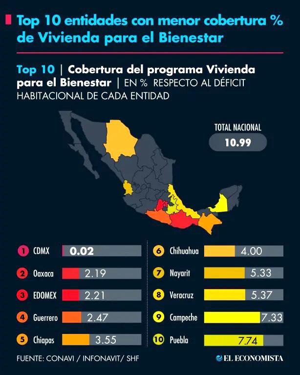 Además de la Ciudad de México, entidades como Oaxaca, Estado de México, Guerrero, Chiapas, Chihuahua, Nayarit, Veracruz, Campeche y Puebla también registran una baja cobertura del programa respecto a su déficit habitacional.