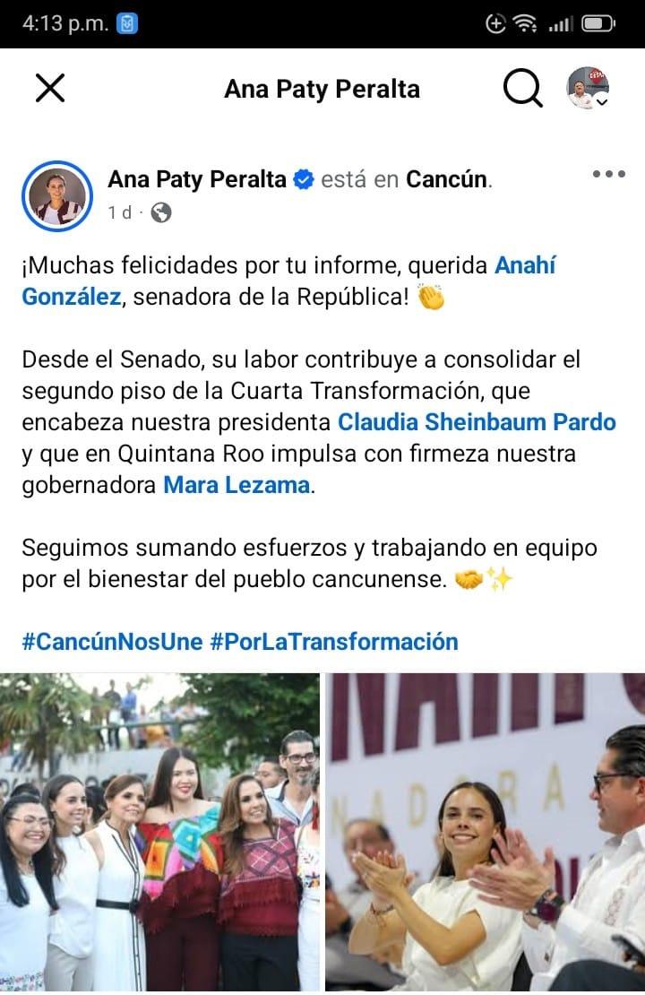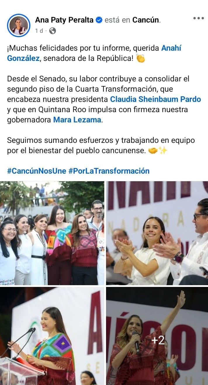 De la misma manera la Alcaldesa de Cancún, Ana Paty Peralta felicita a su amiga Anahí González: “Desde el Senado, su labor contribuye a consolidar el segundo piso de la Cuarta Transformación, que encabeza nuestra presidenta Claudia Sheinbaum Pardo y que en Quintana Roo impulsa con firmeza nuestra gobernadora Mara Lezama”. Seguimos sumando esfuerzos; precisó.