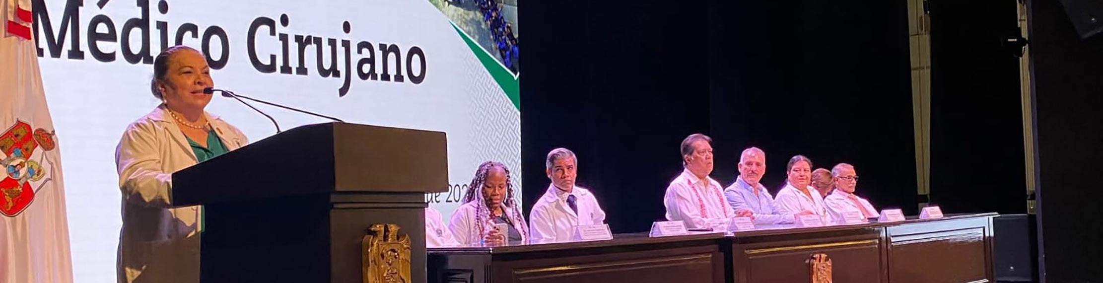 Al dirigir un mensaje, la directora de la DACS, Mirian Carolina Martínez López, reconoció el respaldo de la Coordinación de la Licenciatura en Médico Cirujano y resaltó el alto desempeño de la generación 2025 en el Examen General de Egreso de Licenciatura del CENEVAL. Al respecto, precisó que de los 188 estudiantes que lo presentaron, 70 recibieron el fistol de excelencia por su destacado rendimiento, colocando a la UJAT entre las mejores escuelas de medicina del país.