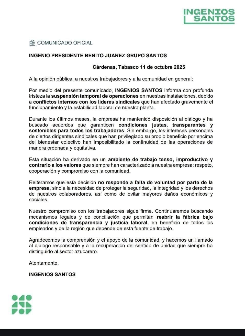 “A la opinión pública, a nuestros trabajadores y a la comunidad en general: Por medio del presente comunicado, INGENIOS SANTOS informa con profunda tristeza la suspensión temporal de operaciones en nuestras instalaciones, debido a conflictos internos con los líderes sindicales que han afectado gravemente el funcionamiento y la estabilidad