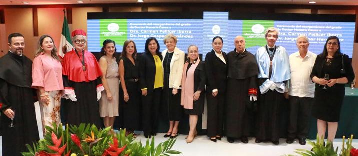 En ceremonia encabezada por la Universidad Olmeca, se otorgó el reconocimiento Doctor Honoris Causa a Carmen Pellicer Iborra y Jorge Gaspar Hernández, en honor a sus destacadas contribuciones a la educación, la salud y el bienestar social, así como por su compromiso con el desarrollo humano y la transformación del conocimiento.
