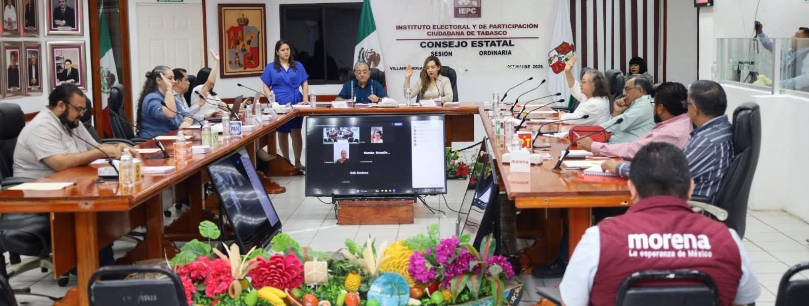 El IEPC Tabasco llevó a cabo una Sesión Ordinaria del Consejo Estatal, integrada por la Consejera Presidenta Elizabeth Nava Gutiérrez; las Consejeras Electorales María Elvia Magaña Sandoval, Ruth Lizette Toledo Peral, Ángela Guadalupe Araujo Segura y Monserrat Martínez Beaurregard; los Consejeros