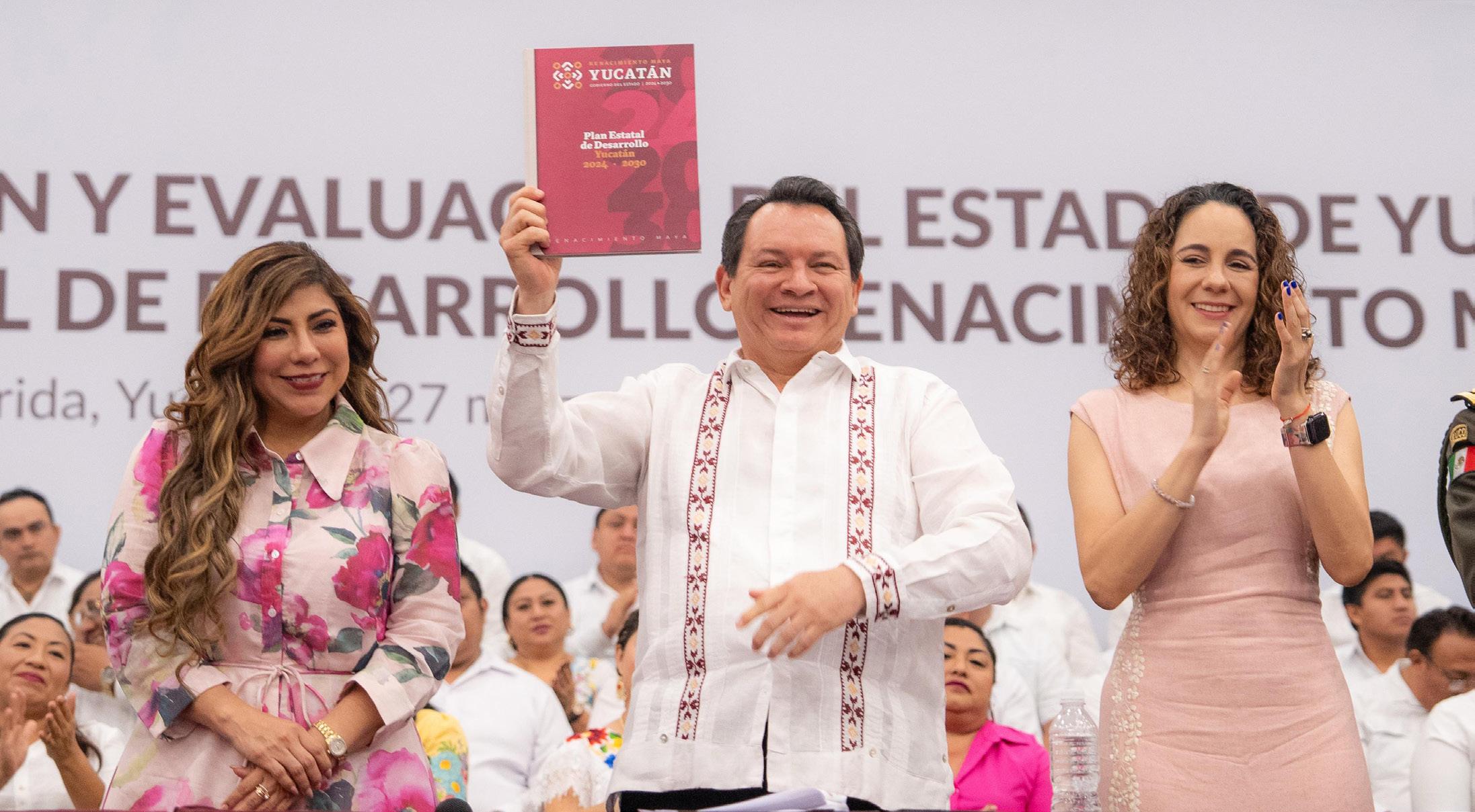 Con firmeza, al presentar el Plan Estatal de Desarrollo Renacimiento Maya 2024-2030 el gobernador de Yucatán Joaquín Díaz Mena, dejó en claro, éste no es un documento “técnico ni un listado de promesas o acciones, es un es la voz del pueblo convertido en ruta” y nace de la voluntad de hacer justicia, de construir un Yucatán con igualdad de oportunidades para todas y todos, donde nadie se quede atrás. Ante cientos de asistentes al Centro Internacional de Congresos de Mérida, el titular del Gobierno del Renacimiento Maya aseguró que el Plan Estatal de Desarrollo Renacimiento Maya 2024-2030, “no fue construido en un escritorio ni desde la comodidad de las oficinas, lo hicimos caminando y escuchando al pueblo entendiendo sus sueños, sus dolores sus carencias, fue construido en el territorio escuchando a quienes más lo necesitan”.