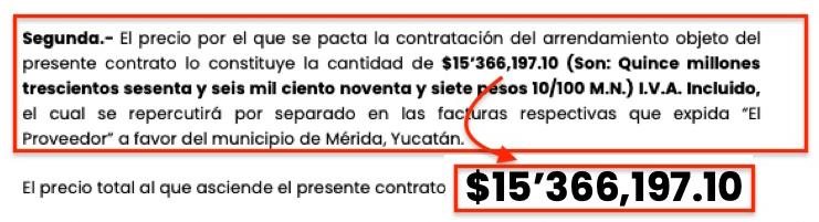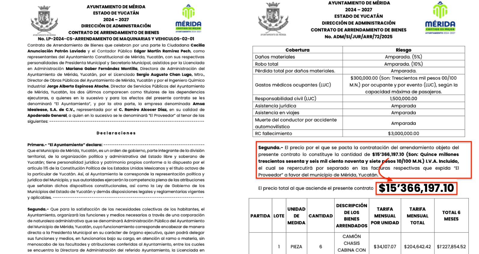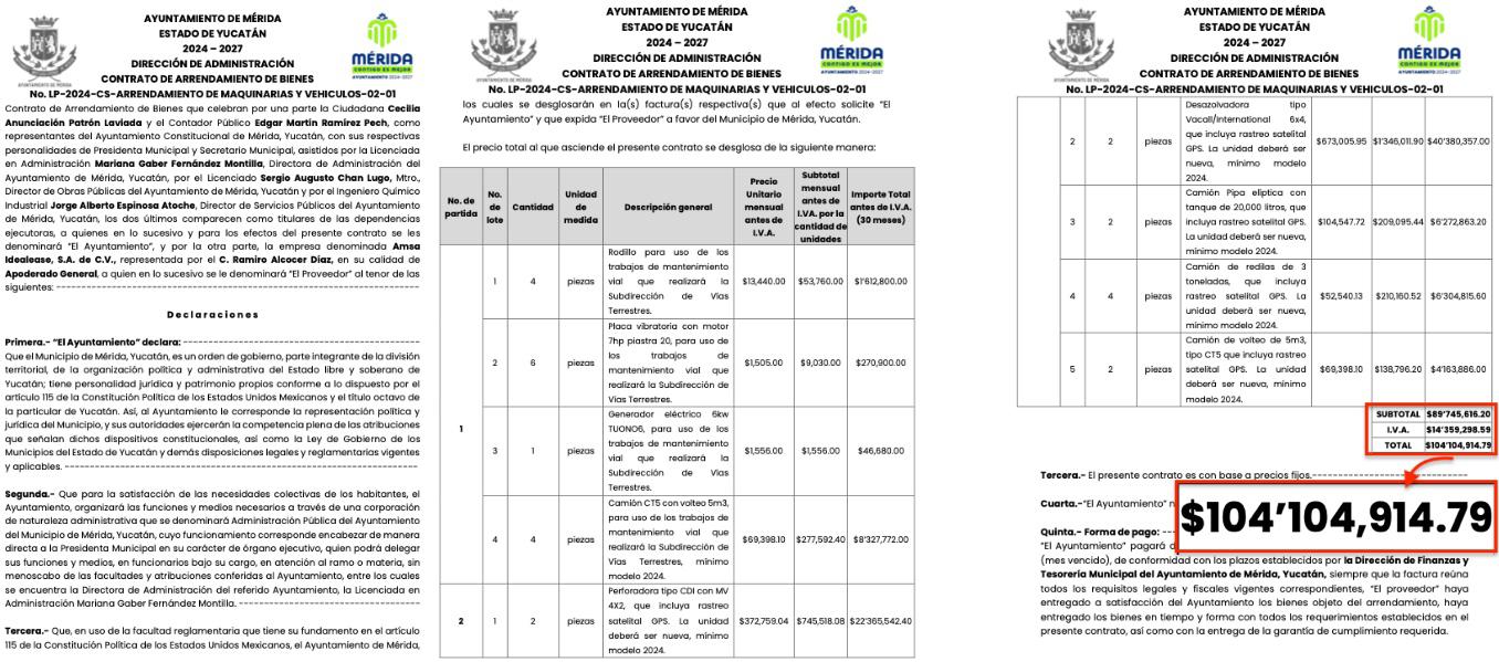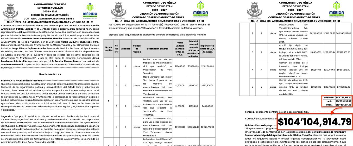 bre para ser más exactos, la alcaldesa de Mérida, Cecilia Patrón Laviada, avaló y firmó el contrato LP-2024-CS-ARRENDAMIENTO DE MAQUINARIAS Y VEHÍCULOS -02-01, que pese a que fue un proceso de licitación, AMSA fue la única que presentó oferta económica y a la postre ganó los servicios consistentes en el arrendamiento de maquinaria y vehículos para trabajos de mantenimiento vial por un plazo de 30 meses a partir de enero del año 2025. El monto del contrato, que incluye el arrendamiento de 2 desazolvadoras tipo Vacall/International 6x4, cuatro camiones CT5 con volteo 5m3, para uso de los trabajos de mantenimiento vial que realizará la Subdirección de Vías Terrestres, dos camiones camiones de pipa elíptica con tanque de 20,000 litros, cuatro camiones de redilas de 3 toneladas y 2 perforadoras tipo CDI con MV 4X2, que incluya rastreo satelital GPS, entre otras maquinarias, es de $104 millones 104 mil 914.79 pesos. Los otros servidores púbicos que firmaron el contrato Edgar Martín Ramírez