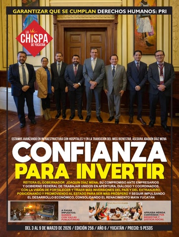 cipios como Mérida, Umán y Progreso. REAFIRMA A EMPRESARIOS COMPROMISO DE IMPULSO ECONÓMICO El gobernador Joaquín Díaz Mena reafirmó el compromiso de su administración con el sector empresarial para impulsar el desarrollo económico, fortalecer la inversión, generar empleos y consolidar a Yucatán como una plataforma logística e industrial estratégica a nivel nacional e internacional, mientras que por su parte, la clase empresarial mostró su plena confianza en el gobierno del estado, ante la seguridad, la estabilidad política y social indispensables para la inversión. Durante la toma de protesta del Consejo Directivo 20262027 a la que asistió invitado por los empresarios a encabezar el evento, el gobernador del Renacimiento Maya Joaquín Díaz Mena reiteró la importancia del trabajo conjunto ente gobierno y empresarios. La coordinación con el sector productivo es clave para atraer inversión y generar empleos, afirmó. En su mensaje ante representantes del sector empresarial, el mandatario destacó que Yucatán crece cuando el sector productivo y el gobierno trabajan con visión compartida, porque la inversión, el empleo y la estabilidad se construyen con diálogo permanente. Al encabezar la toma de protesta del Consejo Directivo 2026-2027 de la Confederación Patronal de la República Mexicana (Coparmex) en Mérida, agradeció el trabajo coordinado del presidente saliente de Coparmex Mérida, Emilio Blanco del Villar, y deseó éxito al presidente entrante, David Reyes Agui ar. Consciente de la parte importante del motor económico de Yucatán son los empresarios, Díaz Mena reconoció que, en esta nueva etapa, el Consejo Directivo 2026-2027 asume la representación de empresarias y empresarios que generan oportunidades, arriesgan capital y sostienen miles de empleos en el estado, con impacto directo en la calidad de vida de las familias yucatecas.
