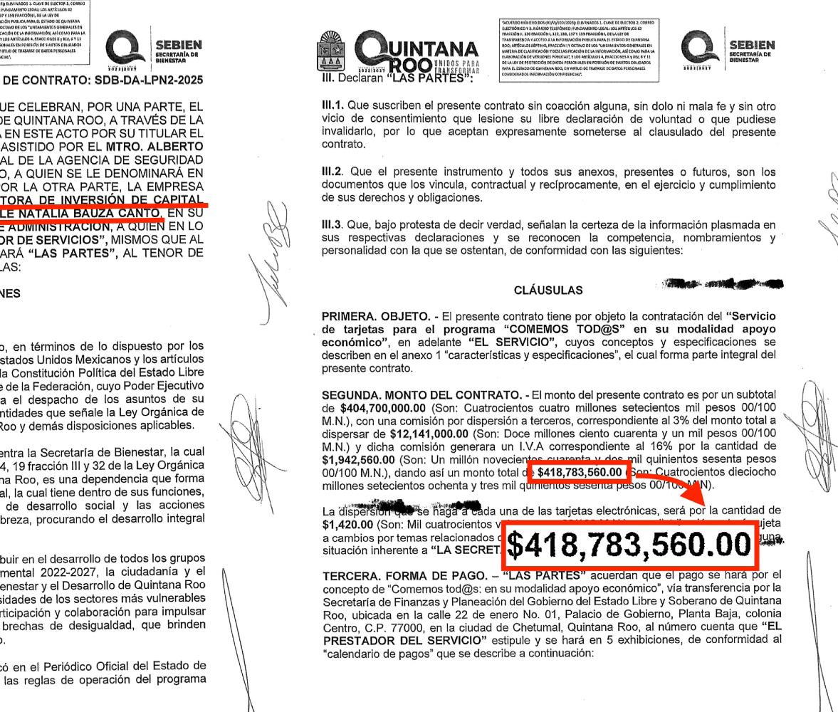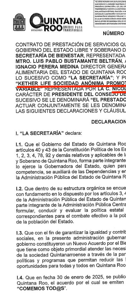 LA EMPRESA KETHER LIFE SAPI DE CV, CONSTITUIDA EN MORELIA, MICHOACÁN, Y QUE CASUALMENTE APENAS EL PASADO MES DE ENERO DE 2025 MODIFICÓ SU OBJETO SOCIAL PARA PODER OFRECER LA EMISIÓN O COMERCIALIZACIÓN DE TARJETAS DE SERVICIOS, DE CRÉDITO O DE TARJETAS PREPAGADAS -Y CAMBIÓ SU DOMICILIO FISCAL A CANCÚN- FUE CONTRATADA POR PABLO BUSTAMANTE, TITULAR DE LA SECRETARÍA DE BIENESTAR (SEBIEN) QUINTANA ROO, PARA EL SERVICIO DE TARJETAS PARA EL PROGRAMA "COMEMOS TODOS" POR UN MONTO DE $418 MILLONES 783 MIL 560 PESOS.