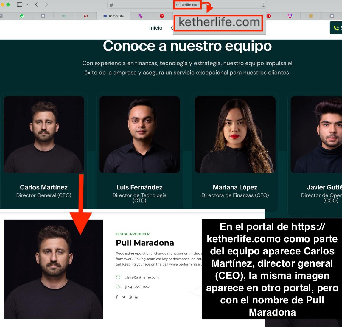Al realizar una búsqueda en el Portal de Transparencia, resulta que la empresa KETHER LIFE nunca ha ejercido un solo contrato como proveedor en la administración pública federal, estatal o municipal; es más, ni siquiera aparece en el padrón de proveedores. Es más, su portal https://ketherlife. com pareciera apócrifo, pues, aunque señala que da confianza a sus clientes para la dispersión de dinero para un futuro seguro, al llegar al apartado: conoce nuestro equipo, solo se trata de nombres y fotografías ficticias, que fue-