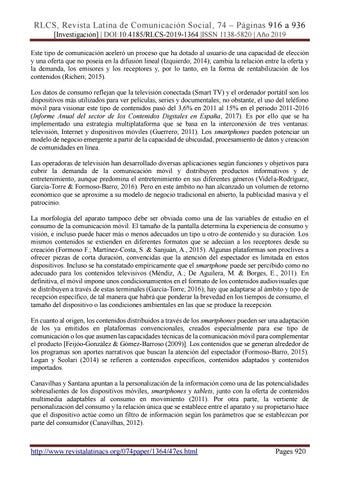 RLCS, Revista Latina de Comunicación Social, 74 – Páginas 916 a 936 [Investigación] | DOI:10.4185/RLCS-2019-1364 |ISSN 1138-5820 | Año 2019 Este tipo de comunicación aceleró un proceso que ha dotado al usuario de una capacidad de elección y una oferta que no poseía en la difusión lineal (Izquierdo; 2014); cambia la relación entre la oferta y la demanda, los emisores y los receptores y, por lo tanto, en la forma de rentabilización de los contenidos (Richeri; 2015). Los datos de consumo reflejan que la televisión conectada (Smart TV) y el ordenador portátil son los dispositivos más utilizados para ver películas, series y documentales; no obstante, el uso del teléfono móvil para visionar este tipo de contenidos pasó del 3,6% en 2011 al 15% en el periodo 2011-2016 (Informe Anual del sector de los Contenidos Digitales en España, 2017). Es por ello que se ha implementado una estrategia multiplataforma que se basa en la interconexión de tres ventanas: televisión, Internet y dispositivos móviles (Guerrero; 2011). Los smartphones pueden potenciar un modelo de negocio emergente a partir de la capacidad de ubicuidad, procesamiento de datos y creación de comunidades en línea. Las operadoras de televisión han desarrollado diversas aplicaciones según funciones y objetivos para cubrir la demanda de la comunicación móvil y distribuyen productos informativos y de entretenimiento, aunque predomina el entretenimiento en sus diferentes géneros (Videla-Rodríguez, García-Torre & Formoso-Barro; 2016). Pero en este ámbito no han alcanzado un volumen de retorno económico que se aproxime a su modelo de negocio tradicional en abierto, la publicidad masiva y el patrocinio. La morfología del aparato tampoco debe ser obviada como una de las variables de estudio en el consumo de la comunicación móvil. El tamaño de la pantalla determina la experiencia de consumo y visión, e incluso puede hacer más o menos adecuados un tipo u otro de contenido y su duración. Los mismos contenidos se extienden en diferentes formatos que se adecúan a los receptores desde su creación (Formoso F.; Martínez-Costa, S. & Sanjuán, A., 2015). Algunas plataformas son proclives a ofrecer piezas de corta duración, convencidas que la atención del espectador es limitada en estos dispositivos. Incluso se ha constatado empíricamente que el smartphone puede ser percibido como no adecuado para los contenidos televisivos (Méndiz, A.; De Aguilera, M. & Borges, E., 2011). En definitiva, el móvil impone unos condicionamientos en el formato de los contenidos audiovisuales que se distribuyen a través de estas terminales (García-Torre; 2016); hay que adaptarse al ámbito y tipo de recepción específico, de tal manera que habrá que ponderar la brevedad en los tiempos de consumo, el tamaño del dispositivo o las condiciones ambientales en las que se produce la recepción. En cuanto al origen, los contenidos distribuidos a través de los smartphones pueden ser una adaptación de los ya emitidos en plataformas convencionales, creados especialmente para ese tipo de comunicación o los que asumen las capacidades técnicas de la comunicación móvil para complementar el producto [Feijóo-González & Gómez-Barroso (2009)]. Los contenidos que se generan alrededor de los programas son aportes narrativos que buscan la atención del espectador (Formoso-Barro, 2015). Logan y Scolari (2014) se refieren a contenidos específicos, contenidos adaptados y contenidos importados. Canavilhas y Santana apuntan a la personalización de la información como una de las potencialidades sobresalientes de los dispositivos móviles, smartphones y tablets, junto con la oferta de contenidos multimedia adaptables al consumo en movimiento (2011). Por otra parte, la vertiente de personalización del consumo y la relación única que se establece entre el aparato y su propietario hace que el dispositivo actúe como un filtro de información según los parámetros que se establezcan por parte del consumidor (Canavilhas, 2012).