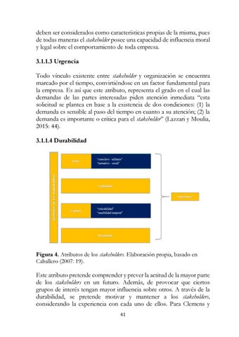 deben ser considerados como características propias de la misma, pues de todas maneras el stakeholder posee una capacidad de influencia moral y legal sobre el comportamiento de toda empresa. 3.1.1.3 Urgencia Todo vínculo existente entre stakeholder y organización se encuentra marcado por el tiempo, convirtiéndose en un factor fundamental para la empresa. Es así que este atributo, representa el grado en el cual las demandas de las partes interesadas piden atención inmediata “esta solicitud se plantea en base a la existencia de dos condiciones: (1) la demanda es sensible al paso del tiempo en cuanto a su atención; (2) la demanda es importante o crítica para el stakeholder” (Lazzari y Moulia, 2015: 44). 3.1.1.4 Durabilidad