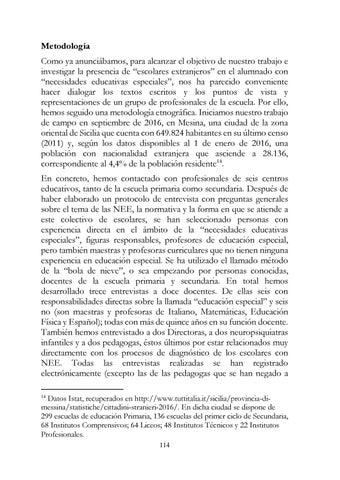 Metodología Como ya anunciábamos, para alcanzar el objetivo de nuestro trabajo e investigar la presencia de “escolares extranjeros” en el alumnado con “necesidades educativas especiales”, nos ha parecido conveniente hacer dialogar los textos escritos y los puntos de vista y representaciones de un grupo de profesionales de la escuela. Por ello, hemos seguido una metodología etnográfica. Iniciamos nuestro trabajo de campo en septiembre de 2016, en Mesina, una ciudad de la zona oriental de Sicilia que cuenta con 649.824 habitantes en su último censo (2011) y, según los datos disponibles al 1 de enero de 2016, una población con nacionalidad extranjera que asciende a 28.136, correspondiente al 4,4% de la población residente14. En concreto, hemos contactado con profesionales de seis centros educativos, tanto de la escuela primaria como secundaria. Después de haber elaborado un protocolo de entrevista con preguntas generales sobre el tema de las NEE, la normativa y la forma en que se atiende a este colectivo de escolares, se han seleccionado personas con experiencia directa en el ámbito de la “necesidades educativas especiales”, figuras responsables, profesores de educación especial, pero también maestras y profesoras curriculares que no tienen ninguna experiencia en educación especial. Se ha utilizado el llamado método de la “bola de nieve”, o sea empezando por personas conocidas, docentes de la escuela primaria y secundaria. En total hemos desarrollado trece entrevistas a doce docentes. De ellas seis con responsabilidades directas sobre la llamada “educación especial” y seis no (son maestras y profesoras de Italiano, Matemáticas, Educación Física y Español); todas con más de quince años en su función docente. También hemos entrevistado a dos Directoras, a dos neuropsiquiatras infantiles y a dos pedagogas, éstos últimos por estar relacionados muy directamente con los procesos de diagnóstico de los escolares con NEE. Todas las entrevistas realizadas se han registrado electrónicamente (excepto las de las pedagogas que se han negado a Datos Istat, recuperados en http://www.tuttitalia.it/sicilia/provincia-dimessina/statistiche/cittadini-stranieri-2016/. En dicha ciudad se dispone de 299 escuelas de educación Primaria, 136 escuelas del primer ciclo de Secundaria, 68 Institutos Comprensivos; 64 Liceos; 48 Institutos Técnicos y 22 Institutos Profesionales. 14