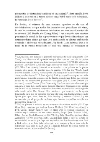 momentos de distensión terminen en una sangría23. Esta presión lleva incluso a colocar en la trama ciertos temas tabú como son el suicidio, la eutanasia a o el aborto24. De hecho, el culmen de este entorno opresivo se da con el descubrimiento de que todos los humanos son portadores del virus, lo que los convierte en futuros caminantes sea cual sea el motivo de su muerte (213 Beside the Dying Sides). Una situación que termina por minar la moral de los supervivientes y que lleva a situaciones tan estremecedoras como que una Lori embarazada se plantee qué puede ocurrirle si el feto no sale adelante (301 Seed). Cabe destacar que, a lo largo de la cuarta temporada se abre una brecha de esperanza al