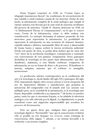Harry Nyquist conjeturó en 1928, en ―Certain topics in telegraph transmission theory‖, las condiciones de reconstrucción de una variable o señal continua a partir de sus muestras. Dicho de otro modo, la información completa de la señal analógica que cumple el criterio anterior está descrita por la serie total de muestras resultantes del proceso de muestreo. Claude E. Shanon demostró en 1948, en ―A Mathematical Theory of Communication‖, en lo que se conoce como Teoría de la Información, cómo se debe realizar esta cuantificación. La entropía determina el número promedio de bits necesarios para representar la información. La posibilidad de representar la información en una secuencia de números binarios; copiable infinita e idéntica, transmisible (libre de error) y almacenable de forma barata y segura, aceleró la tercera revolución industrial. Desde este punto de vista, se podría decir incluso que las otras dos ―ces‖ bases de la revolución tecnológica: comunicación y contenido son consecuencias de esta primera: computación. Estos principios desdoblan la tecnología en dos partes bien diferenciadas: una dura (hardware), anfitriona, y otra blanda (software) compuesta de información; ya sea en forma de datos o de procesos. El hardware es materia, máquina, mientras que el software es intangible, instrucciones. La producción artística contemporánea en la confluencia del arte y la tecnología es, desde finales del siglo XX y principios del siglo XXI, mayormente digital; salvo escasas rarezas y con la excepción del uso de dispositivos híbridos o transductores que permiten la interacción del computador con el mundo real. Las razones son múltiples pero, en la sociedad de la información, es la tecnología más barata, disponible, establecida y en expansión 20 (de hecho en muchos países, entre los que se encuentra España, se ha jubilado la televisión analógica y ha sido relevada por la digital). La digitalización se puede considerar como una migración imprescindible que reordena los procesos de Restauración. Esto no quiere decir que, cualquier bien producido con tecnología digital es ―Restaurable‖ sino que la conservación evolutiva sólo es posible en este dominio. La recreación, como estrategia de conservación, debe migrar 21, además, a un sistema favorable a la evolución: a un sistema complejo. 17
