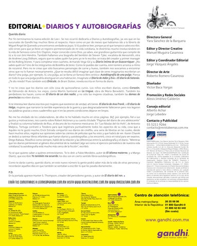 EDITORIAL+DIARIOS Y AUTOBIOGRAFÍAS Querido diario: Por fin terminamos la nueva edición de Lee+. Se nos ocurrió dedicarla a Diarios y Autobiografías, ya ves que en las sucursales de Gandhi hay muchos libros al respecto. Hace como un par de meses que habíamos ido a la librería de Miguel Ángel de Quevedo y encontramos verdaderas joyas. Si tú pudieras leer, porque ya sé que tampoco sabes escribir, sólo sirves para que yo lleve un registro pormenorizado de mi vida cotidiana, te divertirías mucho involucrándote en la vida de famosos como Eric Clapton, mejor conocido como Dios, ya sabes, ese grandioso guitarrista que compite de tú a tú con Jimi Hendrix. También hallamos una biografía del bembón de Steven Tyler, vocalista de Aerosmith, otra de Andrew Loog Oldham, seguro que no sabes quién fue pero yo te lo escribo: se trata del creador y primer manager de los Rolling Stones. Y para completar este cuarteto, Armando Vega-Gil y su Diario íntimo de un Guacarróquer. ¿No sabes quién es? Uno de los integrantes de Botellita de Jerez. Como te puedes dar cuenta, este número arranca a ritmo de rocanrol. Pero no te creas que sólo buscamos personajes de carne y hueso, también nos avocamos a encontrar otros que no lo fueran necesariamente. ¿Que te resulta difícil imaginar qué clase de seres imaginarios escribirían un diario? Una pulga, por ejemplo. Sí, una pulga, así se llama un famoso libro erótico: Autobiografía de una pulga. Piensa en todo lo que una pulga podría atestiguar en una habitación. Imagínate el Diario de Adán y Eva o El diario de Satanás. ¿Te dio miedo? Pues también está Drácula, de Bram Stoker, novela escrita en forma de diario. Y no te creas que los diarios son sólo cosa de quinceañeras cursis. Los niños escriben diarios, como Corazón, de Edmondo de Amicis; los viejos, como Martín Santomé en La tregua, obra de Mario Benedetti. También los perdedores los hacen, como en El diario de un don nadie, y no sólo las mujeres citadinas, también las damas de provincias escriben diarios. Si te interesa leer diarios escritos por mujeres que existieron de verdad, ahí tienes El diario de Ana Frank, o El diario de Helga, mujeres que narraron la terrible experiencia de la guerra y que desgraciadamente fallecieron pero nos legaron sus palabras gracias a esos cuadernillos que ni en las peores condiciones dejaron en limpio. No me he olvidado de los colaboradores, de ellos te he hablado mucho en otras páginas. Bef, por ejemplo, fiel a sus gustos y motivaciones, nos cuenta sobre Robert Aickman y su cuento titulado “Páginas del diario de una adolescente” y finalizó su columna hablando de Rius, el decano de los moneros mexicanos. En “Las fábulas del tío Hofs”, de Antonio Malpica, Tortuga contrató a Teodoro para que registrara puntualmente todos los aspectos de su vida, cosa que a Aquiles no le gustó mucho; Erick Estrada compartió sus diarios de cinéfilo, una serie de libretas en las cuales, desde hace muchos años, registra sus opiniones sobre las cientos de películas que ha visto y que habrá de ver. Karen Chacek se dedicó a rastrear libros infantiles que fueran diarios y autobiografías: y los encontró, cinco en total para ser exactos. Diego Rabasa, filosófico como siempre, habló de la relación y las diferencias entre la autobiografía y el diario: “Mientras que los diarios pertenecen al género documental de la realidad (algo así como el ejercicio periodístico de nuestra vida cotidiana) la autobiografía está mucho más cerca de la ficción”, escribió. Ya sé que quieres saber a quiénes entrevistamos. Te lo diré: a Fabio Morábito, autor de El idioma materno, y a Margo Glantz, que escribió Yo también me acuerdo; los dos son en cierto sentido libros autobiográficos. Como te darás cuenta, querido diario, en este nuevo número la gente podrá saber más de la vida de otras personas y recordarán aquellos días en que también se sentaban a escribir lo que les pasaba diariamente. P.D. En la portada aparece Hunter S. Thompson, creador del periodismo gonzo, y autor de El diario del ron. +