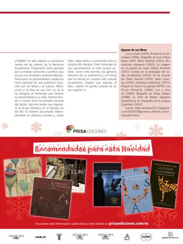 todo, haber leído y conservado toda su producción literaria. Este homenaje es una aproximación, lo más certera posible, sobre este escritor, los géneros literarios de su preferencia y el influjo que ha tenido en nuestra vida cultural ecuatoriana. Espero que quienes lo lean, valoren el aporte cultural de un ser superior. •