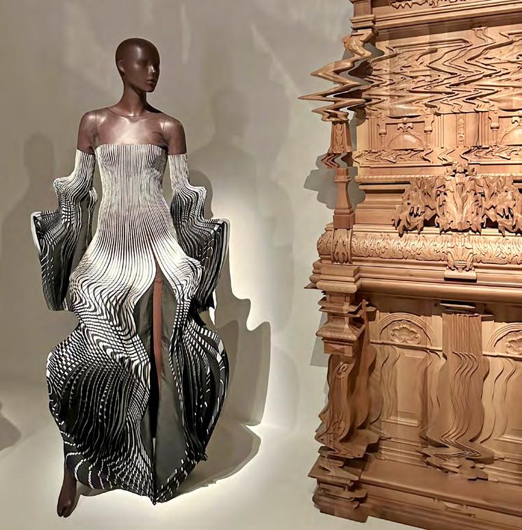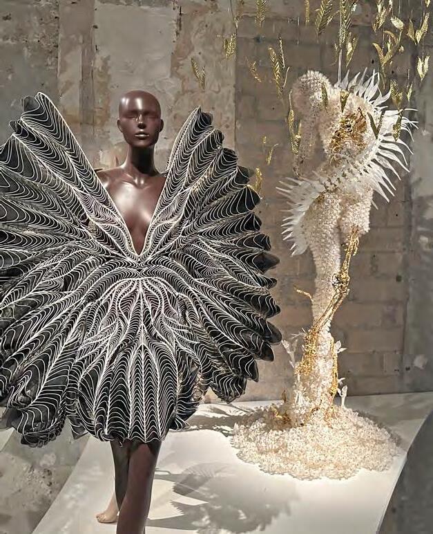 La exposición ofreció un sinfín de looks icónicos, entre los que destacan el vestido cóctel Nautilus con aspecto óseo junto a las esculturas conceptuales de Wim Delvoye. También, el público pudo observar minuciosamente su prenda bautizada como Robe Cathedral, de aire gótico y que destaca por haber sido hecha con impresión 3D.