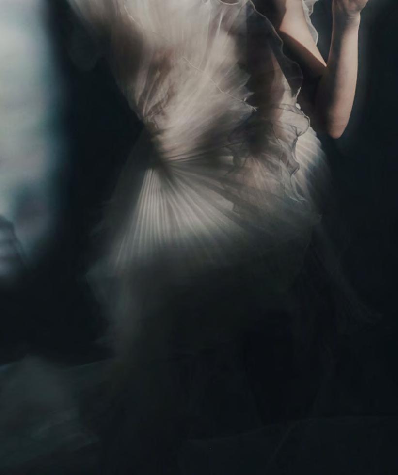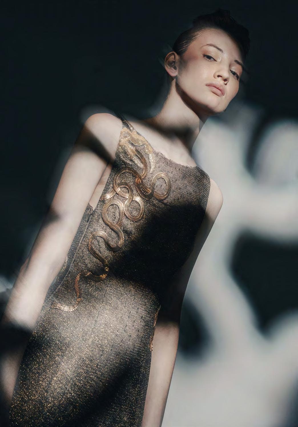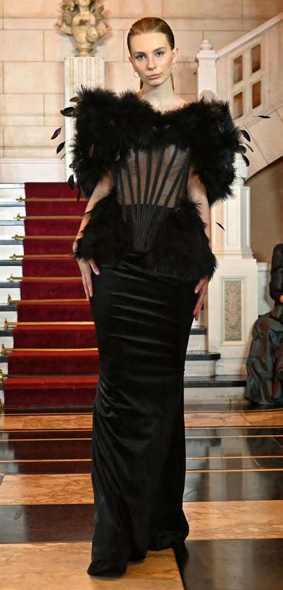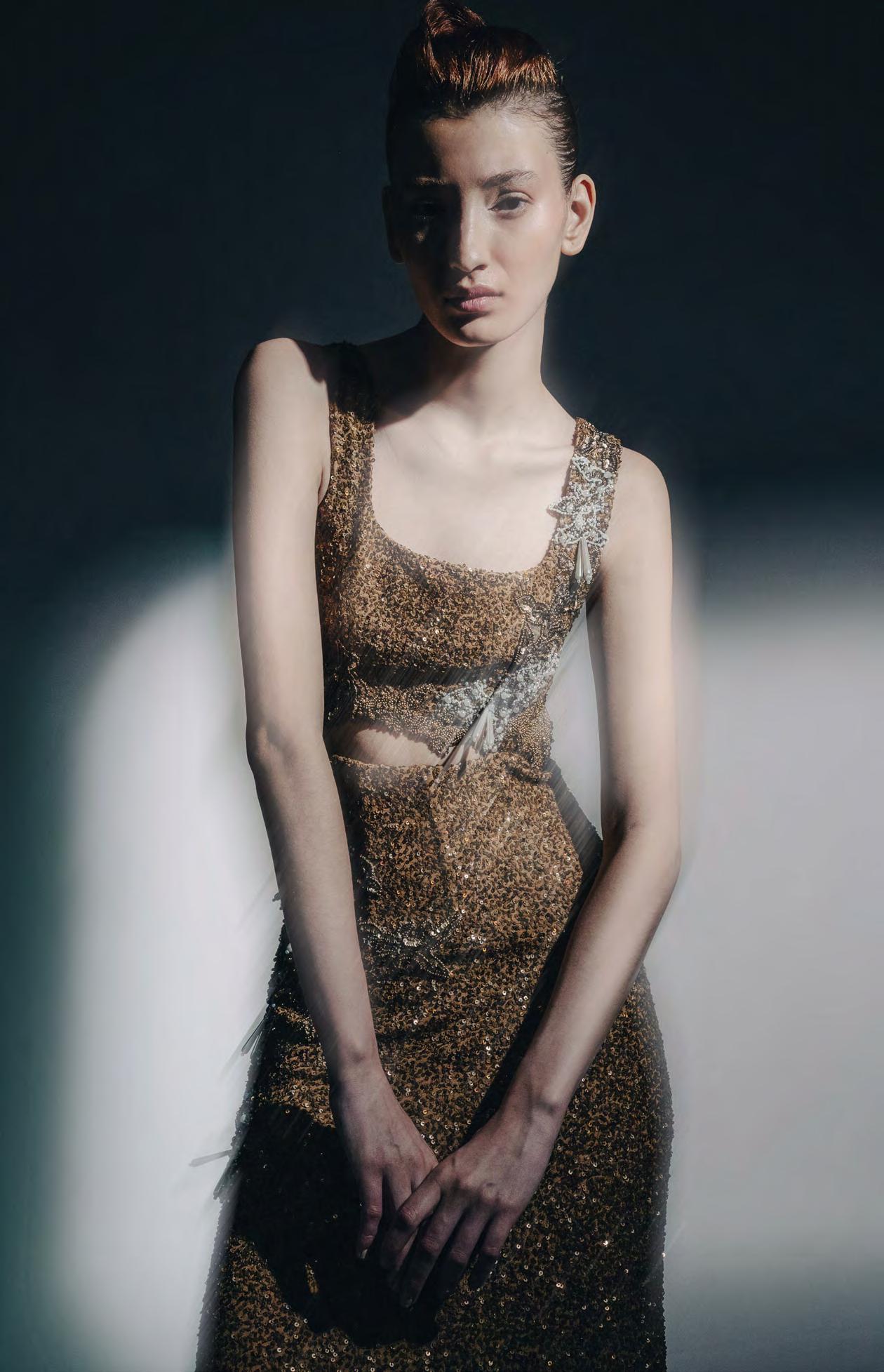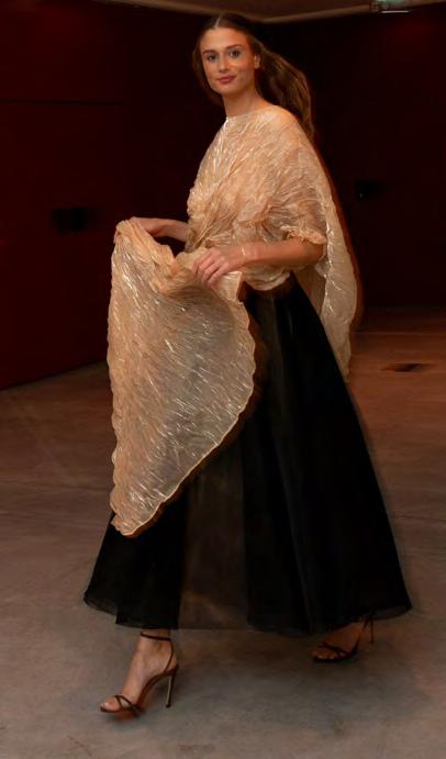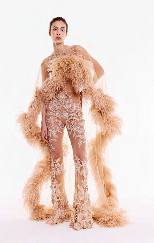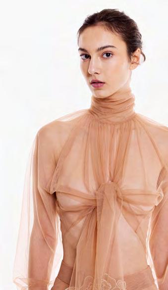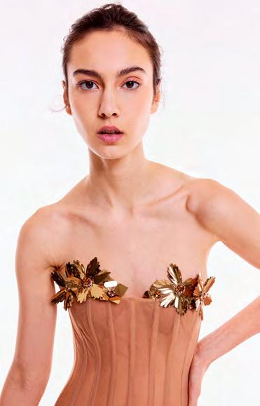 El relato se traduce en piezas que fusionan técnica, emoción y materia. Vestidos de noche, conjuntos y prendas de cóctel trabajadas en hilos de seda natural, tules, calados Richelieu y aplicaciones en volumen 3D. Cada bordado, cada textura, hace visible el tiempo y la destreza detrás del proceso.