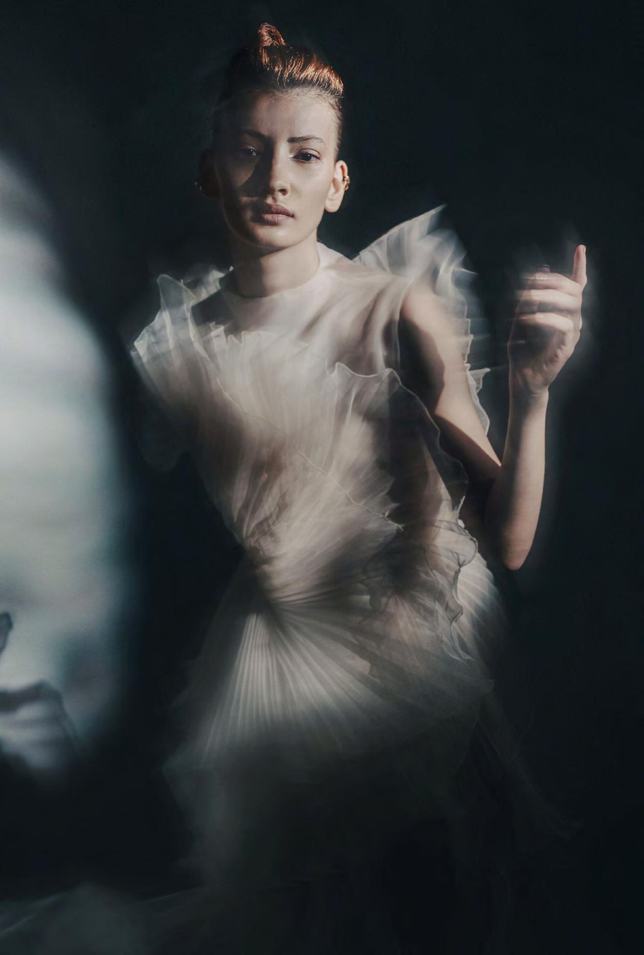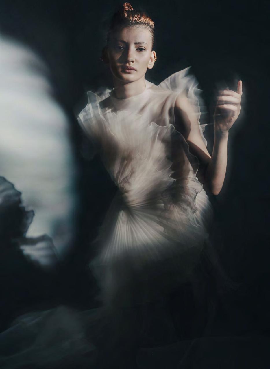 Entre las piezas más signifcativas, el diseñador menciona un vestido de tul nude con bordados en seda y hojas caladas a mano. “Simboliza el momento de la partida: es etéreo, casi como si fotara, pero con raíces bordadas que lo conectan a la