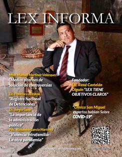 LEX INFORMA, año 1, núm. 6, octubre, 2020. Es una publicación quincenal editada por Corporativo Jurídico LEX, S.A. de C.V., Estado de México, C. P. 55600. Tel: 55 7996 8503 y 55 7996 8517. Editor responsable: Rosa Alicia Cruz Hernández, por el Instituto Nacional del Derecho de Autor. Impresa por Corporativo Jurídico LEX, Estado de México. Este número se terminó de imprimir el 15 de octubre de 2020, con un tiraje de 10,000 ejemplares. Las opiniones expresadas por los autores no necesariamente reflejan la postura del editor de la publicación. Se autoriza la reproducción total o parcial del contenido aquí publicado sin fines de lucro, siempre y cuando se cite la fuente completa. Hecho en México, LEX INFORMA. Todos los derechos reservados © 2020.