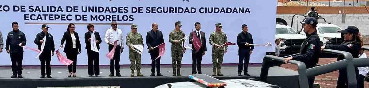 Autoridades del Gobierno Edomex y del municipio de Ecatepec durante la entrega de patrullas. Foto Javier Salinas Cesáreo