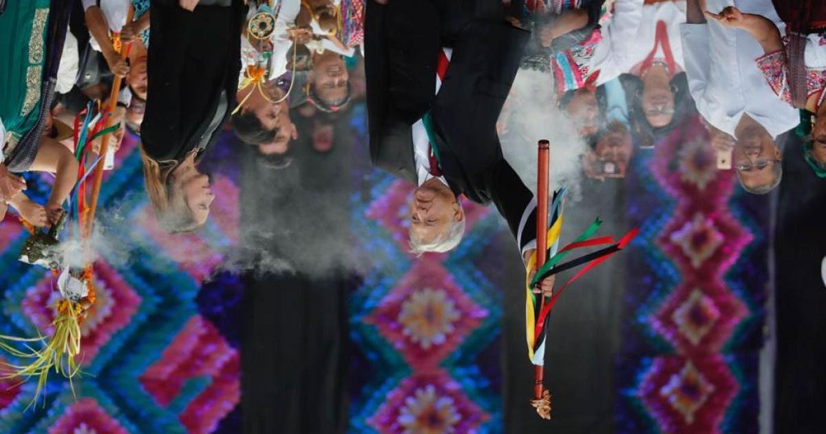 Amlo recibiendo un supuesto bastón de mando de los Pueblos indígenas