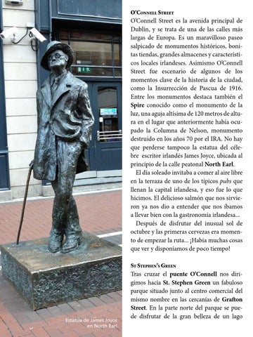 O’Connell Street es la avenida principal de Dublín, y se trata de una de las calles más largas de Europa. Es un maravilloso paseo salpicado de monumentos históricos, bonitas tiendas, grandes almacenes y característicos locales irlandeses. Asimismo O’Connell Street fue escenario de algunos de los momentos clave de la historia de la ciudad, como la Insurrección de Pascua de 1916. Entre los monumentos destaca también el Spire conocido como el monumento de la luz, una aguja altísima de 120 metros de altura en el lugar que anteriormente había ocupado la Columna de Nelson, monumento destruido en los años 70 por el IRA. No hay que perderse tampoco la estatua del célebre escritor irlandés James Joyce, ubicada al principio de la calle peatonal North Earl. El día soleado invitaba a comer al aire libre en la terraza de uno de los típicos pubs que llenan la capital irlandesa, y eso fue lo que hicimos. El delicioso salmón que nos sirvieron ya nos dio a entender que nos íbamos a llevar bien con la gastronomía irlandesa... Después de disfrutar del inusual sol de octubre y las primeras cervezas era momento de empezar la ruta... ¡Había muchas cosas que ver y disponíamos de poco tiempo! St Stephen’s Green
