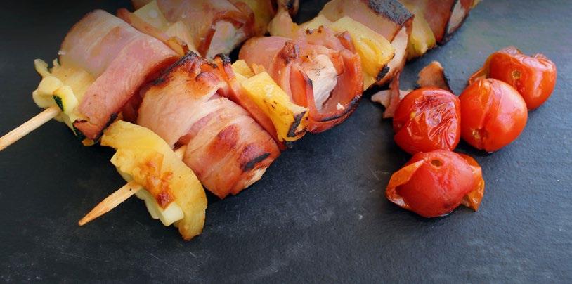 6. Corte o tomate ao meio, regue com o restante azeite, com o vinagre e salpique com o cebolinho picado. Sirva as espetadas com o tomate e com o arroz.