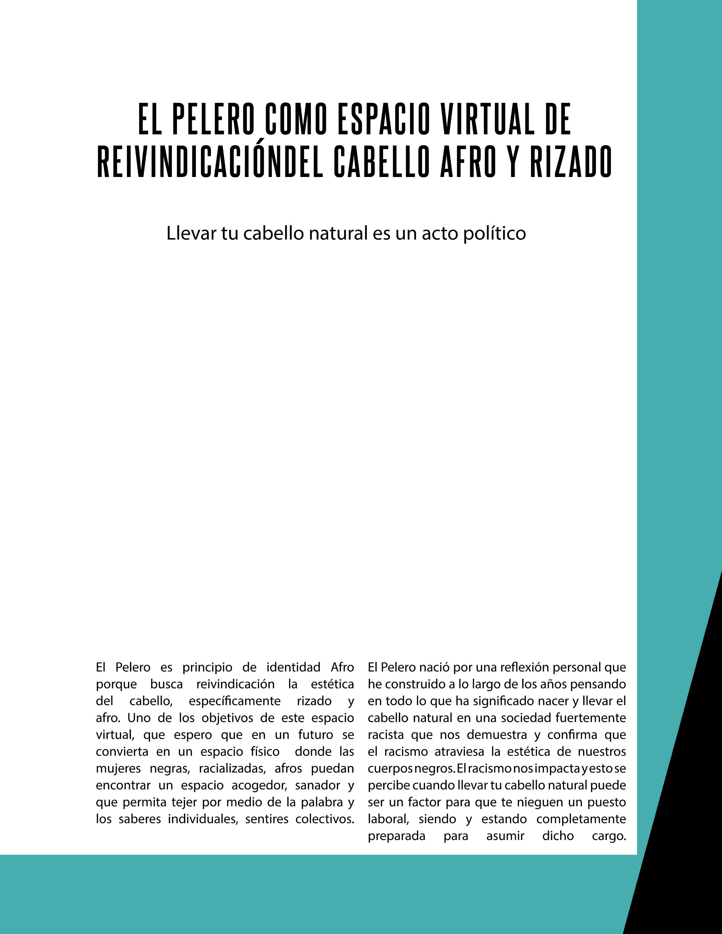 El pelero como espacio virtual de reivindicación del cabello afro y rizado Pag 04 05 L*s cuerp*s, territorios de lucha y resistencia Pag 06 07 La gente negra escribe Pag